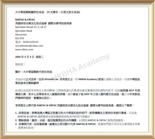 Michelle Lee 女士獲英國 BABTAC & CIBTAC 英國美容治療及化妝品協會 國際治療考試委員會 正式委任為 CIBTAC Strategic Representative, Greater China Region 大中華區戰略代表,並對其超過20多年來於國際美容標準教學經驗高度認可,日後將負責推動 CIBTAC 國際標準在大中華區的認可與發展。